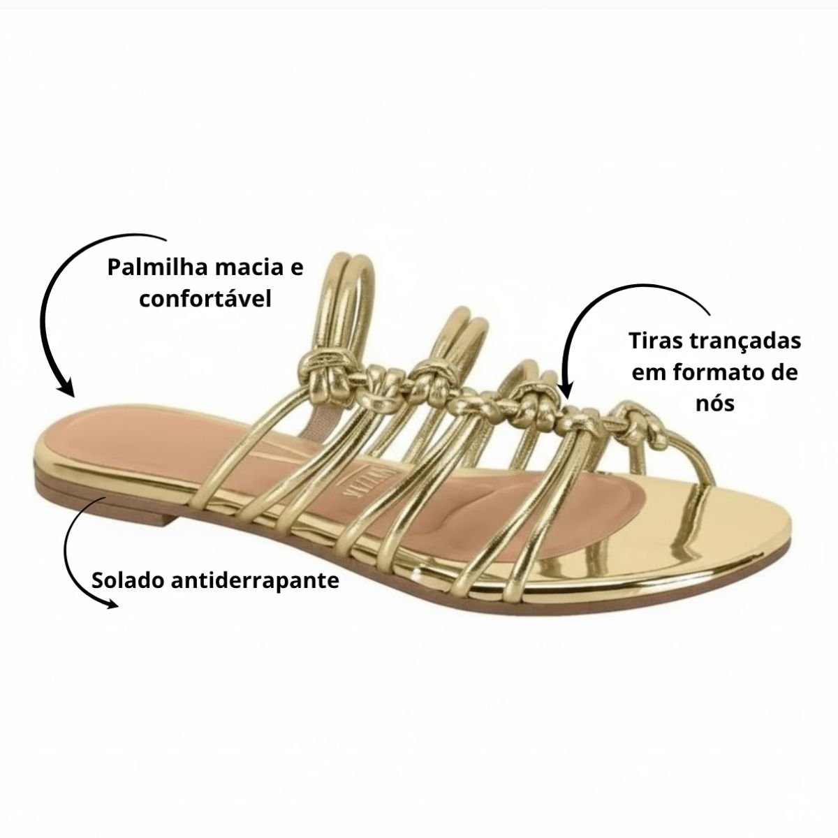 - A Sandália Rasteira Feminina Vizzano Tira Metalizado 6448.119 é perfeita para mulheres que buscam conforto aliado a um toque de estilo moderno. Com design minimalista e tiras finas metalizadas, o modelo traz sofisticação e brilho sutil ao look. Confeccionada em material sintético de alta qualidade, é resistente e fácil de limpar. A palmilha acolchoada garante conforto prolongado, enquanto o solado emborrachado antiderrapante proporciona estabilidade e segurança a cada passo. Ideal para compor looks casuais, festas ou passeios de verão com muito charme.